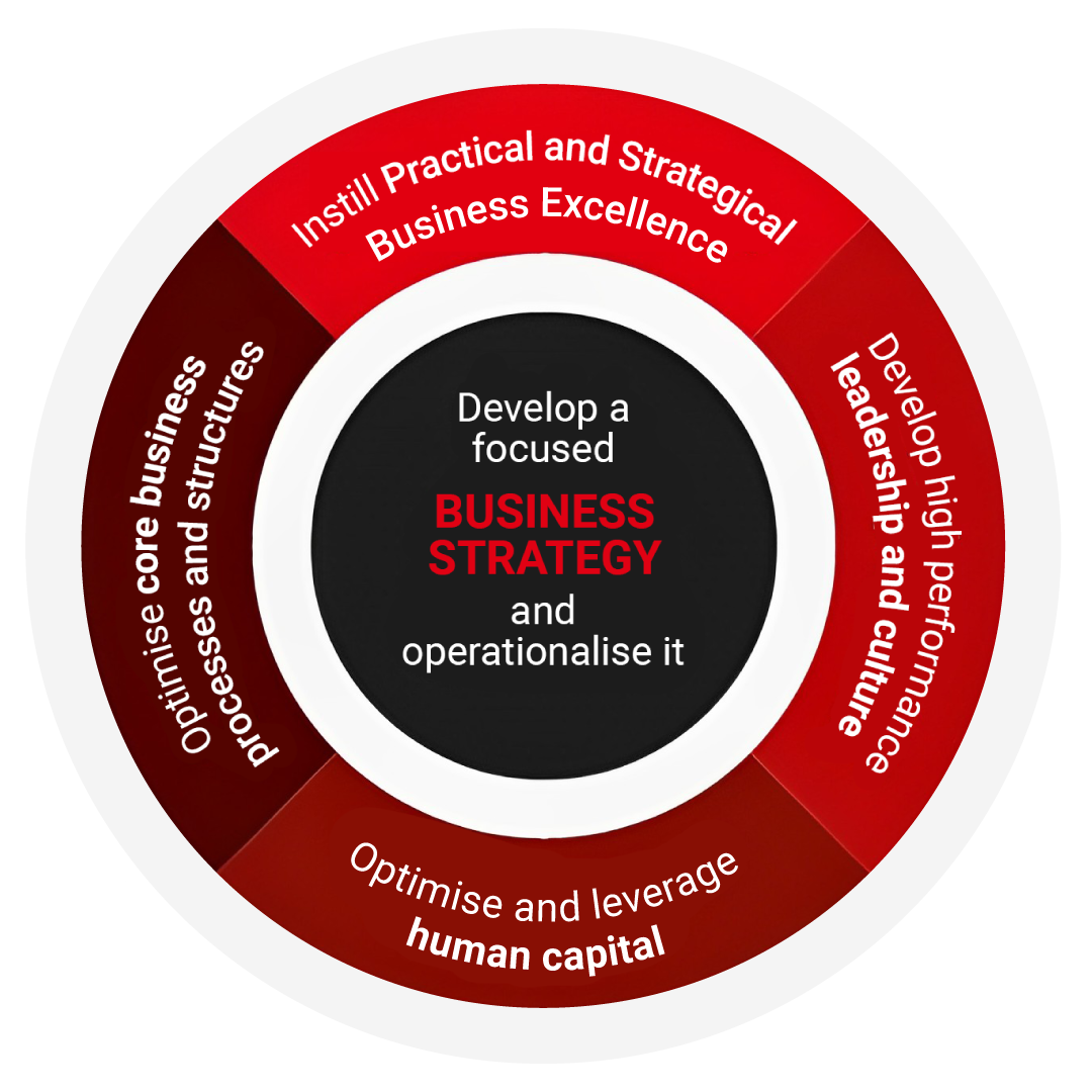 Through People, Leadership, Culture, Strategy, Process Optimization, Organisational Design and Development and applying Practical Tools